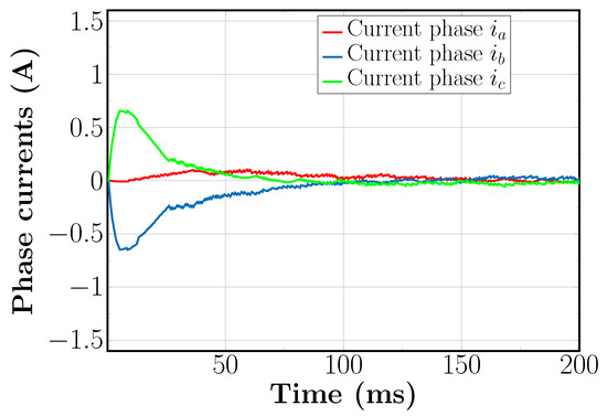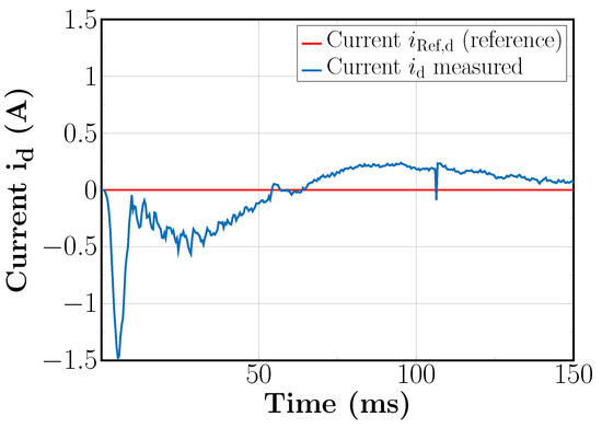 During the acceleration phase, between t = 0 ms and t = 50 ms, it can be seen that the DFC flux linkage signals have a very low frequency due to the fact that the rotor is accelerating from standstill. Furthermore, it can inferred that the three DFC flux linkage signals always add to zero at any instant of time. Based on those DFC flux linkage signals, the estimated rotor position has been computed according to (32), and it can be seen in Figure 16. In addition, in the figure, the real electrical angle of the rotor is depicted for evaluation purposes. From the figure, it can be seen that the estimated electrical position closely follows the real rotor electrical position, especially after t = 75 ms. Clearly, there are certain ripples or oscillations on the estimated rotor position that are inherent to the frequencies involved in the DFC flux linkage signals, with a prominent second and fourth harmonic components of the speed of the machine. The latter was explained in detail by Mantala in [30]. Next, Figure 17 shows the three-phase currents supplied by the inverter to the synchronous motor in the stationary frame. In fact, the frequency of the supplied currents increases as the machine’s rotor accelerates from standstill as is expected. It should be noticed that the shape of the supplied currents follows a sinusoidal shape, although the estimated rotor position deviates a little from the real rotor position. Moreover, the synchronous motor’s currents transformed to the rotating reference frame can be seen for the direct (d-axis) and for the quadrature axis (q-axis) in Figure 18 and Figure 19 respectively.