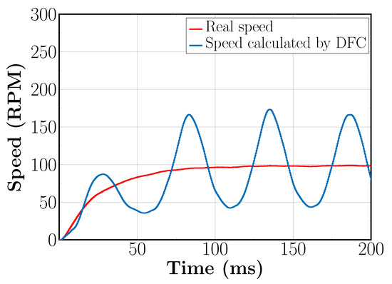 The third simulation performed in this paper is carried out at a low speed. Specifically, we have set the reference for the second simulation as 100 RPM from t = 0 s to t = 200 ms. Moreover, for the simulation at low speed, the load torque was kept constant at = 0.1 Nm during the entire simulation time span. In effect, Figure 21 shows the reference speed for this third simulation and the real speed of the machine obtained from the FE model. In simple terms, Figure 21 is analogous to Figure 13 but for a reference speed of 100 RPM. On the same note, Figure 22 shows the real speed and the speed calculated based on DFC signals for the same simulation. Once again, Figure 22 is analogous to Figure 14 in the previous simulation. Although the speed calculated by DFC deviates in Figure 22 a little bit from the real speed of the machine, the average value of the DFC calculated speed matches the real speed of the machine. Putting it simply, on average, the sensorless speed control loop follows the reference of 100 RPM. The latter can be improved, adjusting the cutoff frequency of the low pass filter within the speed control loop.
