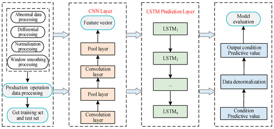 28], and taking advantage of the excellent feature extraction ability of CNN and the advantages of LSTM in analyzing and processing long-range data dependencies, we propose an ultra-short-term condition prediction method combining CNN and LSTM. Firstly, we use CNN to perform feature extraction and dimension reduction of the input production operation data, thus forming valid eigenvectors. Secondly, we input the feature vector into the LSTM network for training to learn the change rule between production operation data, and then realize the ultra-short-term working condition prediction. Finally, we demonstrate the effectiveness of the method through experiments and analyze the applicability and accuracy of the ultra-short-time working condition prediction method.