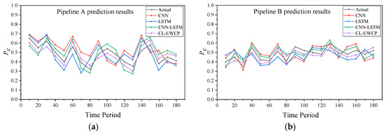 Prediction results of different models for each pipeline: (a) pipeline A prediction results; (b) pipeline B prediction results.