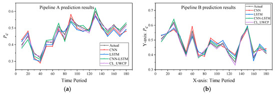 Prediction results pipeline of different models for each pipeline: (a) pipeline A prediction results; (b) pipeline B prediction results.