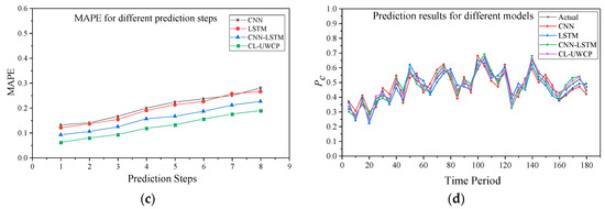 Prediction error for multi-step of different models: (a) RMSE for different prediction steps; (b) MAE for different prediction steps; (c) MAPE for different prediction steps; (d) prediction results for different models.