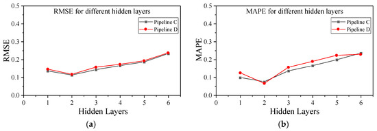 Prediction error with different numbers of hidden layers: (a) RMSE for different numbers of hidden layers; (b) MAPE for different numbers of hidden layers.
