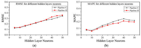 Prediction error with different numbers of hidden layer neurons: (a) RMSE for different numbers of hidden layers neurons; (b) MAPE for numbers of different hidden layers neurons.