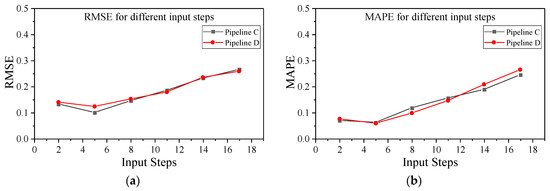 Prediction error with different numbers of input steps: (a) RMSE for different numbers of input steps; (b) MAPE for different numbers of input steps.