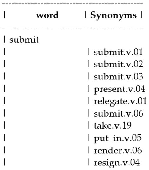 The WordNet lexical database [], has been used to obtain a set of synonyms and hyponyms for every given word. Figure 1 shows the output from finding all synonyms of the word “submit”.