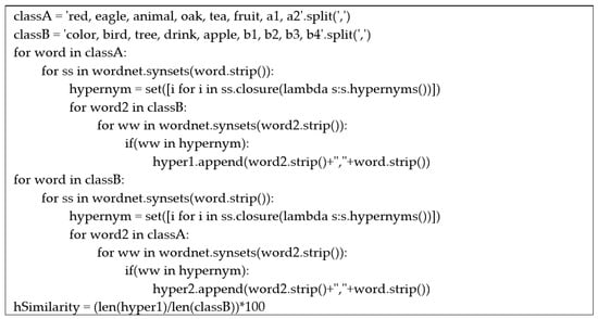 Using Definition 3, we calculate hypernym similarity between classes A and B. Class A has eight data properties, with two of them being hypernyms for data properties from Class B; therefore, hypernym_similarity (A, B) = 25%.