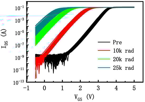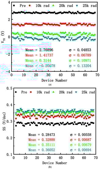 The curves of 68 devices before and after TID irradiation are shown in Figure 1. It can be seen that the curves of the devices shift negatively as the dose increases. The variability between devices increases after irradiation.