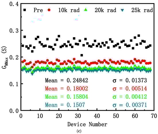 The variation in threshold voltage, subthreshold swing, and maximum transconductance extracted by the curves after irradiation is shown in Figure 2a, Figure 2b, and Figure 2c respectively. The mean value and standard deviation (σ) of the electrical parameters are calculated. With the increase in the total dose, the standard deviation of threshold voltage and subthreshold swing increase, while the standard deviation of maximum transconductance decreases. The experiment results verify the within-batch TID response variability on the VDMOS device since standard deviation measures the dispersion of a dataset relative to its mean value [8].