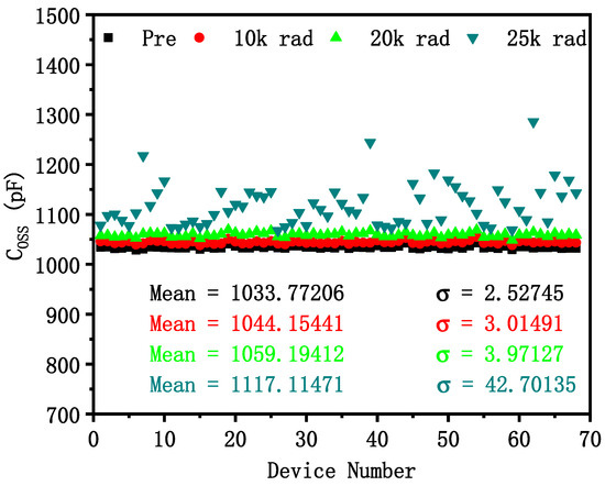 The variation in output capacitance after irradiation is shown in Figure 3. The mean value and standard deviation of the electrical parameters increase after irradiation, which indicates that output capacitance variability also increases after irradiation.