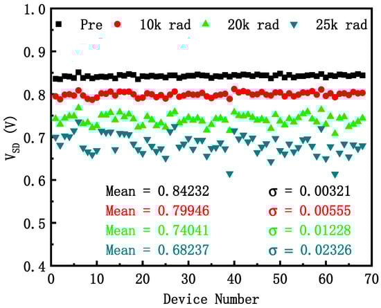 is the forward voltage of the diode between the source and the drain. The threshold voltage reduces significantly or even becomes negative after irradiation, resulting in a conductive channel. Additionally, is across the source, channel, and drain [18,25]. is mainly affected by the threshold voltage, so the trend of within-batch variability is the same as the threshold voltage after irradiation.