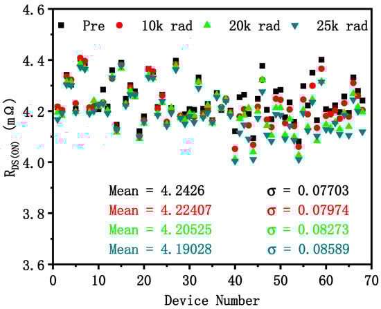 It can be seen from the above results that there is within-batch TID response variability of VDMOS devices in this paper. The changes in parameter variability after irradiation are listed in Table 2.