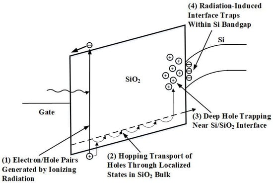 - Therefore, the main reason for the variation in device parameters after irradiation is that the ionizing radiation destroys the energy band equilibrium, generates electron–hole pairs, and forms oxide-trapped charges and interface traps. The oxide layer is the most sensitive part to TID radiation in the MOS system [19].
