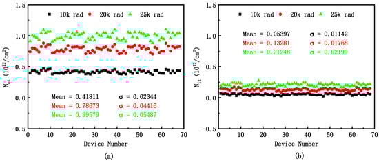 The variation in (a) oxide trapped charge density, (b) interface trap charge density of the devices after irradiation.