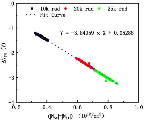 Figure 8 shows the relation between the shift of threshold voltage and the trapped charges of the within-batch devices after irradiation. As seen from the fit curve in Figure 8, the and the present the linear growth trend. For NMOSFET, the oxide-trapped charges cause a negative shift of the threshold voltage, while the interface traps cause a positive shift of the threshold voltage [3,19]. The calculation formula between and trapped charges is [13,22,23,24]: