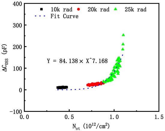 Figure 9 shows the relation between the shift of output capacitance and of the within-batch devices after irradiation. As seen from the fit curve in Figure 9, the variation in and the presents the exponential growth trend. Therefore, the variability of output capacitance increases sharply at 25 krad(Si) in Figure 3. The output capacitance is equal to the sum of the drain-source capacitance and the gate-drain capacitance. The drain-source capacitance is the junction capacitance, which is not changed by the increase in radiation dose [19,33]. Therefore, the variation in output capacitance induced by TID is mainly affected by the gate-drain capacitance, which is a function of oxide capacitance, reverse capacitance, and depleted capacitance [33,34]. The output capacitance is sensitive to , so as to characterize the correlation between and .