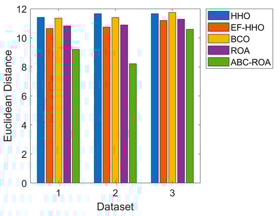 The overall analysis of the recommended ABC-ROA-based privacy preservation model over the Ethereum network with three datasets in terms of Euclidean distance is given in Figure 5. From the analysis, dataset 2 gives a very low Euclidean distance than dataset 1 and 2. While using dataset 2, the developed ABC-ROA-based privacy preservation model gives improved Euclidean distance of 36.03%, 8.62%, 2.54%, and 8.77% over HHO, EF-HHO, BCO, and ROA. In the graph analysis, the developed ABC-ROA method is utilized to show effective performance. Here, the existing EF-HHO algorithm attains second-best performance. While considering all three datasets, the Euclidean distance of the proposed method shows better performance in dataset 2. Thus, the developed ABC-ROA-based data privacy preservation model over the Ethereum network gives higher effectiveness than the other heuristic algorithms.