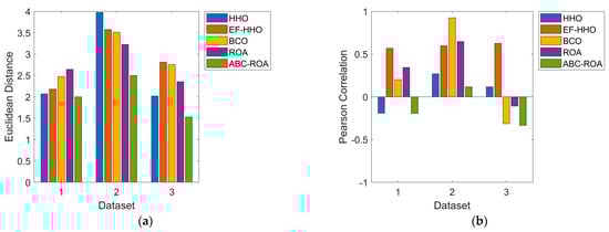 The validation of control for parameters of different existing algorithms regarding Euclidean distance and Pearson and Spearman correlations is shown in Figure 11. Here, the evaluation of the parameter for the proposed ABC-ROA method is taken as ird = 0.06. Throughout the analysis, the developed method achieves enhanced performance compared to the other existing methods.