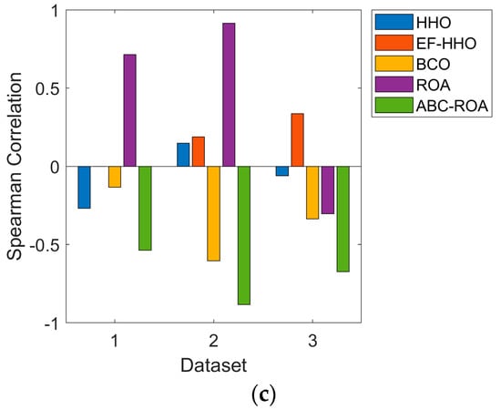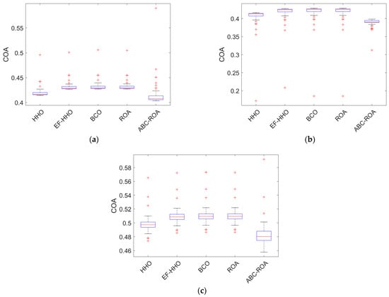 Performance analysis of the developed ABC-ROA based privacy preservation model using COA regarding (a) dataset 1, (b) dataset 2, and (c) dataset 3.
