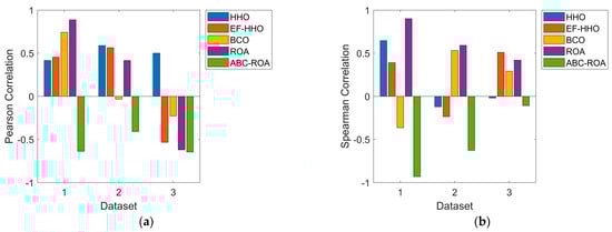 Comparison of the Pearson and Spearman correlations of the designed ABC-ROA-based privacy preservation system among various heuristic algorithms is shown in Figure 7. The sum of the numerical values of each observation divided by the total number of observations is known as the arithmetic mean. From the analysis, the developed ABC-ROA-based privacy preservation achieves secured data transfer when dataset 3 shows a low value. Regarding the spearman correlation value in dataset 2, the developed ABC-ROA-based privacy preservation model has high arithmetic means of 40%, 20%, 20%, and 34.4%, better than HHO, EF-HHO, BCO, and ROA. As a result, the designed ABC-ROA-based privacy preservation system over the Ethereum network shows higher effectiveness than other heuristic algorithms.