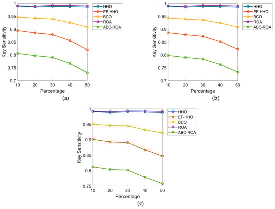 The key sensitivity of the obtained optimum key in the ABC-ROA-based privacy preservation system for three datasets with various existing meta-heuristic algorithms at various percentage levels is shown in Figure 9. The key sensitivity of the proposed system is noticed as a lower value while increasing the percentage of the key for all the three datasets. From the analysis, the developed model shows key sensitivity improvements of 11%, 15%, 20%, and 19% to heuristic algorithms such as HHO, EF-HHO, BCO, and ROA, respectively. In the given graph analysis, it shows the equivalence performance. Based on the key sensitivity value, the ROA algorithm is not effective to secure the data in the blockchain. At learning percentage 30, the key sensitivity of the existing EF-HHO algorithm secures second-best performance. As a result, the suggested blockchain-based privacy preservation model executes more effectively than other heuristic algorithms.