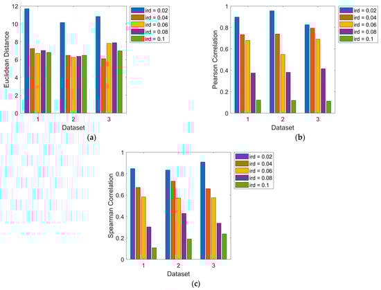 Analysis of controlling the parameters of the designed method using (a) Euclidean distance, (b) Pearson correlation, and (c) Spearman correlation.