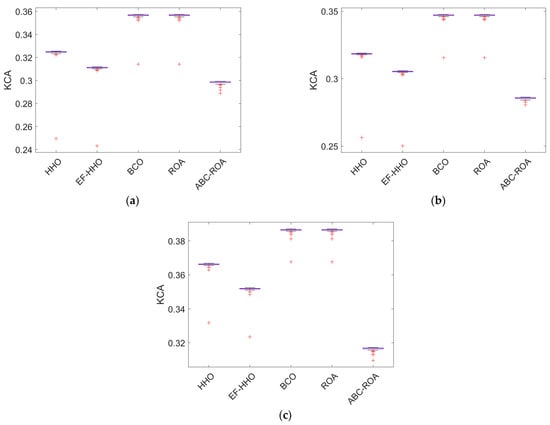 Effectiveness analysis of the implemented ABC-ROA based privacy preservation model using KCA in terms of (a) dataset 1, (b) dataset 2, and (c) dataset 3.