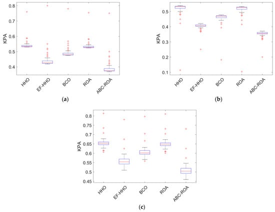 Performance analysis of the developed ABC-ROA based privacy preservation model using KPA regarding (a) dataset 1, (b) dataset 2, and (c) dataset 3.