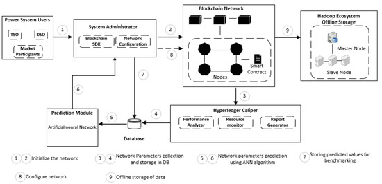 Table 2 presents the tools used to build the proposed architecture. Hyperledger Fabric was used as the blockchain framework and was installed on the Linux operating system. The Docker engine was used to create virtual machines on which each Hyperledger Fabric was embedded in a Docker image. Additionally, Hyperledger Caliper was integrated into the blockchain network to collect information about the network. An ANN was used as a learn-to-predict module to predict transaction throughput and latency to find optimal configurations for the network. The HDFS was used for the off-chain storage of information and data exchange for better performance. A non-relational database, MongoDB, was utilized to store the benchmark results from Hyperledger Fabric for the prediction module. These tools and technologies were integrated to enhance the performance of the proposed blockchain-based data exchange platform for smart grid entities.