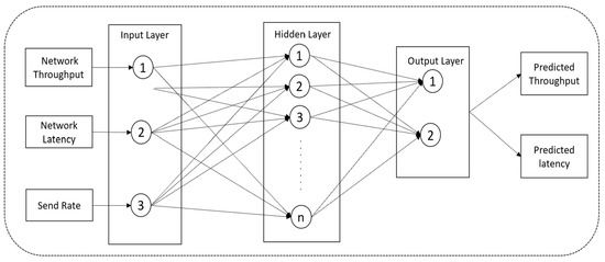 An ANN is a computational model that mimics the structure and function of the human brain. It consists of multiple interconnected processing units, known as neurons, that work together to solve a given problem [39]. An ANN is built with weighted directed graphs as its architecture, where artificial neurons are represented as nodes, and the directed arrows and weights depict the relationship between the neurons’ outputs and inputs. ANNs can be classified into two types based on their architecture: feed-forward networks and recurrent networks. In this paper, a feed-forward ANN is used due to its high potential. To identify the best ANN training module, various configurations are experimented with, such as adjusting the number of neurons in the hidden layer, the learning rate, and the activation function. Multiple rounds of experiments were conducted for each training network configuration, with the average results recorded for later analysis of the random factor used to initialize the ANN network weights. The detailed structure of the learn-to-predict ANN model is presented in Figure 5 [39].