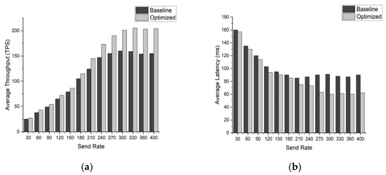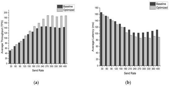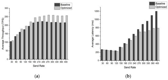 In this section, the effectiveness of the proposed method in optimizing the blockchain network is verified by comparing it with the baseline scheme. The evaluation results of the learn-to-predict method compared to the baseline network are presented using sample data. To evaluate network transaction throughput, Figure 7a,b compares the network throughput and latency respectively of the proposed blockchain performance improvement mechanism based on learn-to-predict with the baseline network, at varying transaction send rates between 30 and 400 tps. The transaction throughput rose exponentially with the sending rate until it reached about 210 tps. As soon as the send rate hit this limit, the rise of transaction throughput slowed down and started to level out. This is because the network exceeded the processing capacity, resulting in a backlog of unconfirmed transactions. Limited block size and high block creation times are the reasons for these saturation on the blockchain network. The network transaction throughput increased by 23.9% to 153.2 tps and 201.4 tps, respectively, when the send rate was raised to 175 tps.
