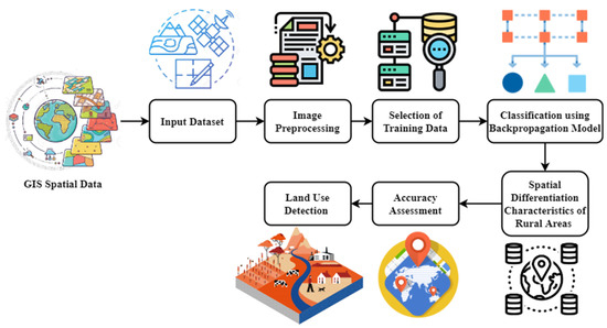 Figure 1 shows the gis-sdm model. The paper uses rural environmental information, specifically climate, temperature, and rainfall data, to discuss land use and land classification (lulc) class changes, extract images from the input dataset [27], and process satellite images. There is a lot of noise in the image, such as electronic noise, optoelectronic noise, AC noise introduced by power supply, shot noise, etc. Preprocessing satellite images is essential before change detection and image classification since it removes chances of errors by the sensor, solar, atmospheric, and topographical factors. It is termed preprocessing when remotely sensed data undergoes radiometric and geometric correction. Image preprocessing in this study included various operations, such as geometric and radiometric correction, gap filling, atmospheric correction, enhancement, subsetting, and band selection. Image classification refers to labeling images with information about their particular topic. The method generates groups of pixels with similar digital values in the same data classes. Six different types of lulc are used: bare land, rural built-up area, agricultural land, forest land, waterbody, and herbaceous land. The current research uses a backpropagation classifier trained using a supervised classification strategy. Supervised classification is based on the notion that users may choose training samples (groups of pixels) from images representative of desired classes. Then, the image processing will use these samples as standards for classifying the other pixels. To train the classifier in this research, uniformly distributed regions of interest in the research region for all class categories are determined utilizing visual interpretation of Landsat imageries. To facilitate the differentiation of lulc classes in the image, true and false combinations have been used to enhance the feature display. Using the rural spatial analysis module, the data are aggregated, synthesized, and analyzed in gis to reveal spatial correlations. Planning for the long-term sustainability of rural areas requires a thorough and timely grasp of lulc, including its pace, trajectory, root causes, and knock-on effects. Providing accurate and up-to-date geographical data on lulc and analyzing modifications in a research area have been two primary uses of remote sensing and gis. RS images are valuable for collecting, evaluating, and modeling lulc information and changes because they accurately represent land use conditions. To monitor land usage and identify changes in the landscape, digital data must be collected, stored, displayed, and evaluated, and gis offers this flexible platform for rural areas’ landscapes.