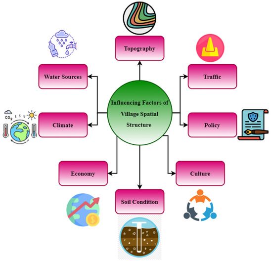 Figure 3 shows the impact factors of village spatial structure. The traditional agricultural economy and the landscape both have a role in the spatial distribution of rural areas. Large-scale towns really cannot develop because of inadequate transportation and services. As the rural population has a certain degree of dispersion, the distribution of rural environmental land is also relatively scattered, showing a dotted distribution that is mainly affected by traffic, terrain, economy, culture, and other factors. There is an unusual spatial structure to villages because of the poor connections between the many communities in the area. Rural areas have an internal structure defined by the arrangement of its constituent parts inside the community’s physical boundaries. This seriously restricts the economic activities between villages. With its complicated topographical setting, slow social and economic growth, and pervasive traditional cultural impact, the spatial layout of rural villages is at the center of this discussion. Affected by terrain and traffic, rural areas are in a relatively closed environment, which seriously restricts economic and cultural exchanges between rural areas and the outside world. Spatial features are the outward manifestation of culturally and climatically informed patterns of space development. In rural distributed populations, farming and planting are the major sources of food production. This area’s rural landscape, mountains, and abundant water supply contribute to a unique pattern of rural development.
