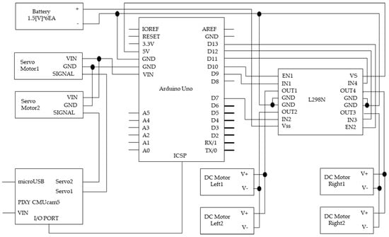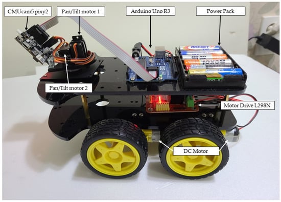 Figure 1 shows the overall block diagram of the AGVA-Robot we used in the paper. Arduino Uno was used as the main board and an ISP port was used to interface with the vision sensor [26]. The CMUcam5 Pixy2 camera was used for color recognition and line tracking [27]. Two servo motors were used to allow the vision sensor to move up, down, left, and right. As the engine of the AGVA-Robot, four servo-type DC motors were used (two on the left and two on the right), and the L298N was used as a driver for operating the four motors [28]. An independent power supply was also equipped.