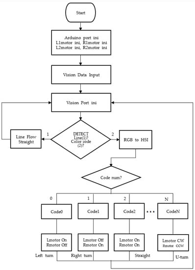 The AGVA-Robot is designed to use a vision sensor to photograph the traveling route, indicated by a black line on a white background, recognize the route by means of the line-tracking algorithm, and follow the color code when it is detected during travel. Figure 4 shows the overall traveling algorithm. After extracting an image from a video, in order to obtain information from the image, it is necessary to separate the objects contained in the image. One of the representative methods for separating objects is binarization. For the study discussed in this paper, the Otsu method was used as the binarization algorithm for line recognition [22]. Additionally, the color coding function of CAMcam5 pixy2 was used to give the driving command from the color code. In CAMcam5 pixy2, the HSI color model was used for color detection. The order of the detected color models was coded and matched with driving commands to be used in the AGV’s driving algorithm.