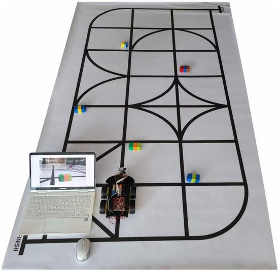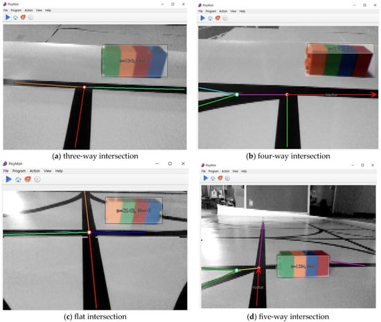 Figure 5 shows a traveling experiment performed in a virtual layout designed to execute a traveling command in an environment where various traveling lines, composed of straight lines, curves, and plane intersections, are drawn for the traveling test of an AGVA-Robot [29,30]. The AGVA-Robot is designed to photograph, using its own camera, a traveling route consisting of a black line on a white background, to recognize lines based on the line tracking algorithm, and to execute various traveling commands based upon the color codes detected at branch points.