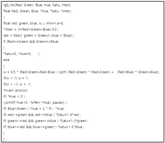 Figure 6 shows source codes of the C language used for programming to convert RGB values to HSI values.