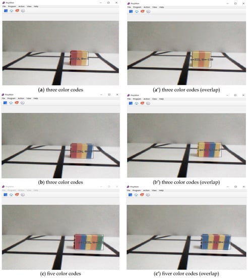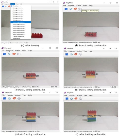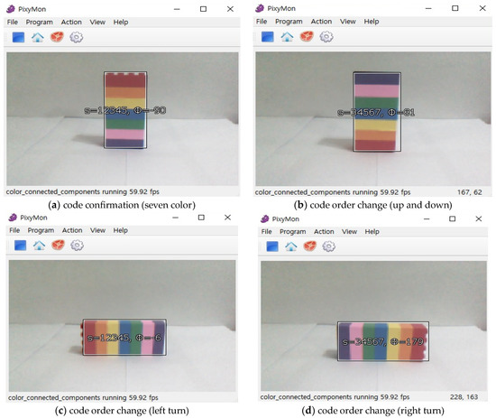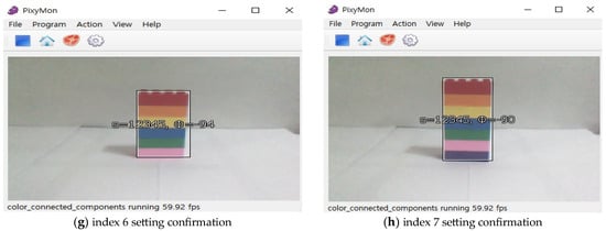 The vision sensor used in this paper can index seven arbitrarily specified colors. The proposed color code is a method for recognizing adjacent specified colors as a single code. Figure 7 shows the setting screen for indexing seven colors that can be saved in the vision sensor. As shown in Figure 7, after indexing red in color 1, orange in color 2, yellow in color 3, blue in color 4, green in color 5, pink in color 6, and purple in color 7, it can be seen that adjacent blocks of seven colors are recognized as a single object.