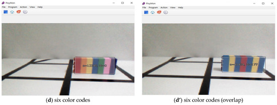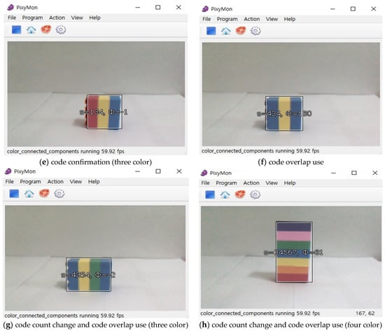 Figure 8 shows the recognition results after the indexed color code changes in various ways. For example, as shown in Figure 8a–d, if the order of the color codes changes in an up-and-down or left-and-right manner, while the colors remain adjacent in the order of the indexed color codes, it is recognized as the same code. However, as shown in Figure 8e–h, if the order of the color code is changed, the number of color codes is changed, or the color code is duplicated, it can be seen that it is recognized as a different color code.