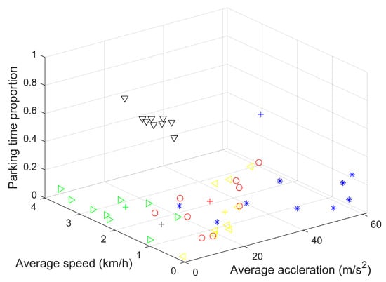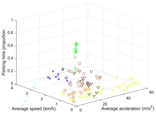 In order to select the driving pattern of the vehicle, historical vehicle speeds are recorded for a period of time, its characteristic parameters are calculated, and the Euclidean distance is used to select the clustering center that is closest to the operating conditions. To illustrate the advantage, a K-means algorithm-based pattern recognition method is developed, where the number of type is also selected as 5, as shown in Figure 6. Additionally, the Davies-Bouldin Index (DB) is utilized to evaluate the performance of different methods [26].