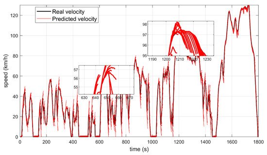 According to the Markov chain model above, the next-time acceleration weighted value corresponding to each vehicle speed is calculated, the vehicle acceleration at the next moment can be predicted at the current time, and the next-time vehicle speed is obtained. This method is used for the WLTC driving cycle, and the predicted horizon is set to 5 s. The result is shown in Figure 8.