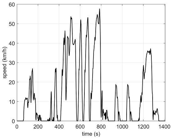 The simulation was conducted under the specified cycle circumstances to assess the efficacy of the control method. The parameter of the vehicle is shown in Table 4. The aforementioned rule-based method and a model predictive control method without pattern recognition are employed for comparison. The WVUCITY driving cycle is utilized for analysis, as shown in Figure 9. The simulation results are shown in Figure 10, Figure 11, Figure 12 and Figure 13, in which the abbreviation PR means pattern recognition.