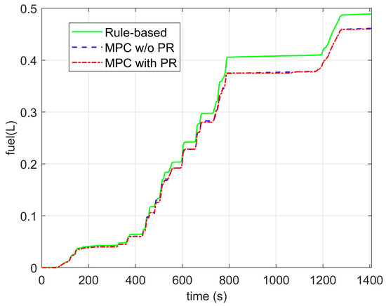 The power of the engine–generator set is shown in Figure 11. It can be seen that, under some conditions with rapid acceleration, the rule-based strategy demands more power that the other two strategies. The fuel consumption results are depicted in Figure 12. The final fuel volumes for the whole cycle of the rule-based strategy, MPC-based strategy without pattern recognition, and MPC-based strategy with pattern recognition are 0.49, 0.47, and 0.45 L. It can be concluded that, compared with the rule-based strategy, MPC-based strategy performs well in terms of the SOC maintenance and fuel efficiency improvement. Additionally, the driving pattern recognition mechanism can help the control algorithm for better performance.