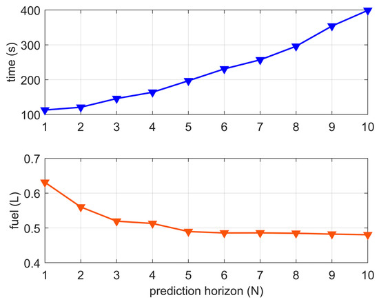To evaluate the computational burden under different prediction horizon of the MPC, numerous simulations are conducted, and the results are illustrated in Figure 13. For the driving cycle with 1400 s, the computational time is acceptable and to balance the computational burden and the fuel efficiency, and the prediction horizon is set to 5 in this paper.
