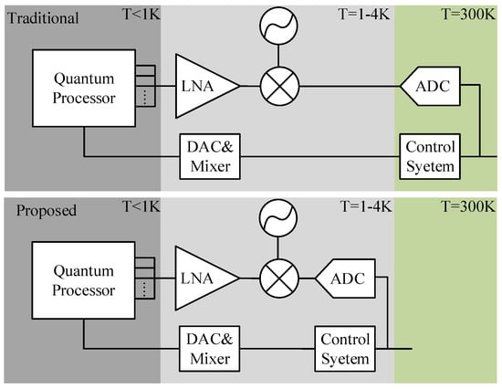 Therefore, making the readout and control circuits operate close to the quantum processor is a reasonable approach to solving the problems [7]. As illustrated in Figure 1, the state-of-art quantum processor control system is composed of two parts working at 300 K and 1–4 K, respectively. The 300 K part consists of ADC and control logic and the 1–4 K part consists of the mixer, digital-to-analog converter (DAC), low-noise amplifier (LNA), high-frequency clock generator, and so on [8]. The proposed cryogenic control system places ADC and control logic at 4.2 K to minimize the coax between RT and LHT.