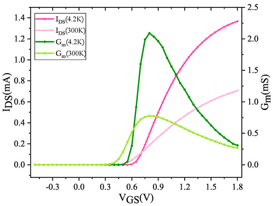 When the transistors produced in thin-oxide SMIC 0.18 μm CMOS technology are put into the 4.2 K liquid helium dewar, many of their characteristics will change greatly. The spice model of normal temperature process-design-kit (PDK) can not predict the behaviors of the devices at 4.2 K anymore [18]. Firstly, the threshold voltage increases apparently with the decrease of temperature due to the rise of Fermi potential and the freeze-out effect. According to the test results, the threshold voltage of NMOS (10 m/180 nm) and PMOS (10 m/180 nm) increases by more than 100 mV and 300 mV at LHT respectively. As a result, under the premise of the same power budget, the operating frequency of circuits, especially digital circuits will decrease at low temperatures. For high operating frequency cryogenic circuits, employing the body effect to reduce and using low threshold voltage transistors are reasonable approaches. Besides, the peak transconductance value () shows a sharper change at 4.2 K than at 300 K which is presented in Figure 2. The reason for the sudden increase of is that the ionized impurity scattering and lattice scattering will be weakened at cryogenic temperature resulting in the rise of carrier mobility () [19]. Assuming that is constant (50 mV, e.g.), the relationship between carrier mobility and is: