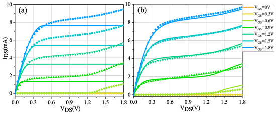 where refers to the flat band voltage, means the Fermi potential and represents the substrate bias effect coefficient. The rise of leads to the decrease of and the increase of so that the kink phenomenon emerges [21]. As shown in Figure 3b, the difference between simulation results based on the revised spice model and the 4.2 K measurement results is tiny. It is worth mentioning that with the progress of the chip process, the kink effect gradually disappears with the decrease of circuit operating voltage. As for the processes above 160 nm, increasing substrate bias and reducing substrate doping concentration are effective to alleviate the kink effect.