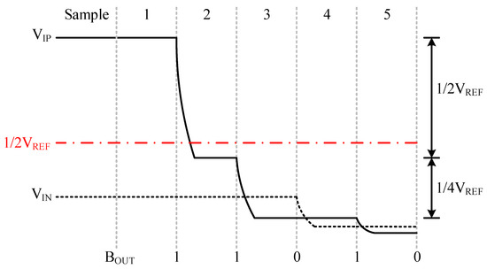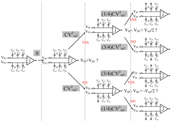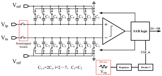 To repress the supply and substrate voltage noise, the fully differential architecture is adopted which also has good common-mode noise suppression capability. Because of the fully differential scheme, the operations of the two input nodes are complementary. Take the positive end operation of the ADC as an example. In the sampling stage, the top plate of the capacitor is charged to via the bootstrapped switches, which is conducive to the establishment speed and input bandwidth [25]. Meanwhile, the bottom plates of the capacitor are reset to . Afterward, the bootstrapped switches are disconnected during the hold stage and the comparator begins the first comparison without any switching operation of the capacitor. According to the output of comparator, the maximum capacitor that has been charged to a higher voltage potential is connected to ground while the other one (possesses lower voltage potential) maintains the initial state.