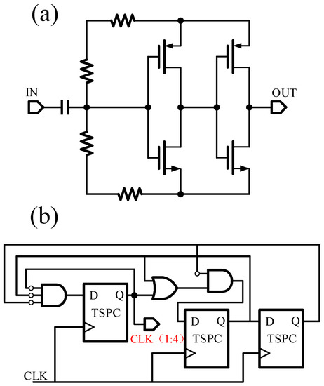 Figure 4 illustrates the detailed diagram of the proposed cryogenic SAR ADC. Fundamentally, it comprises a double-tail dynamic comparator, bootstrap sample-and-hole (S/H) circuit, capacitor array and successive approximation registers. To achieve lower power consumption and better linearity, this design employs a monotonic switching procedure [22,23]. The capacitor array is binary-weighted [24]. The CLK_in is generated by an off-chip sine wave signal which will be converted into a square wave through a wave shaping circuit and then passes through a frequency divider with a duty ratio of 1:4. The detail of the transform block is illustrated in Figure 5. Figure 5a is the schematic of the sinusoidal-to-square wave transform circuit. These resistors with the same resistance value ensure a 1:1 duty cycle and the two inverters convert the sine wave into a square wave. Figure 5b is the diagram of the one-fifth frequency divider. The sample clock of the proposed architecture is generated at the output node of the first stage TSPC.