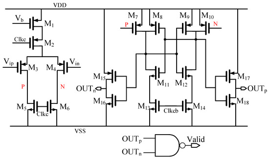 Figure 8 illutrates the transistor-level circuit of proposed dynamic comparator. In the conversion phase, the input voltage of the comparator is gradually approaches the ground. To function properly within the input common-mode voltage range from half to ground, the comparator employs a P-type input pairs. When the clock control signal Clkc of the comparator is high voltage, node N and node P are discharged to GND, indicating that the comparator is in the reset stage [27]. On the contrary when Clkc goes to low level, node N and node P are charged at different charging speeds according to the electrical level of the input signal / , and the comparator is in comparison stage. Meanwhile, the outputs of the latching circuit are drawn to VDD at the reset stage. Once the preamplifier goes to the comparison stage, assuming node N charges faster, the M10 turns off first and the drain of M10 starts discharging through a parasitic capacitor where the drain of M7 maintains high level due to the positive feedback effect. Thus, the changes to high level and the keeps low. Eventually, the Valid signal generateded by the and passing through NAND gate turns to high level to enable asynchronous control logic.